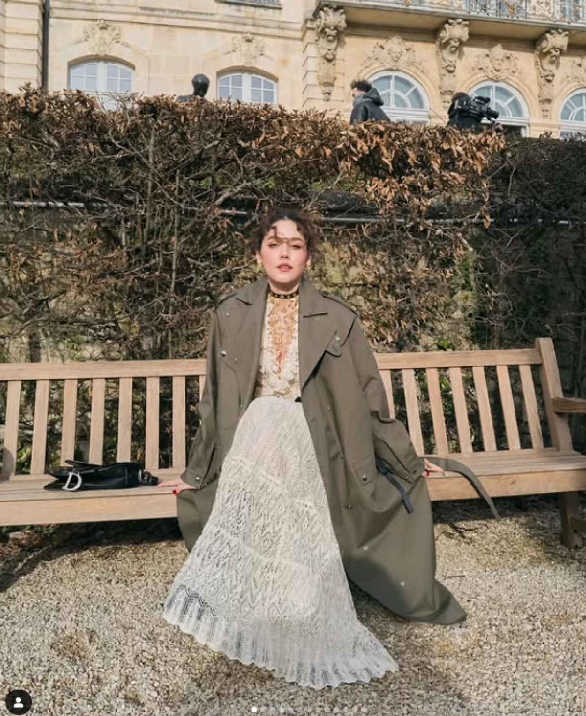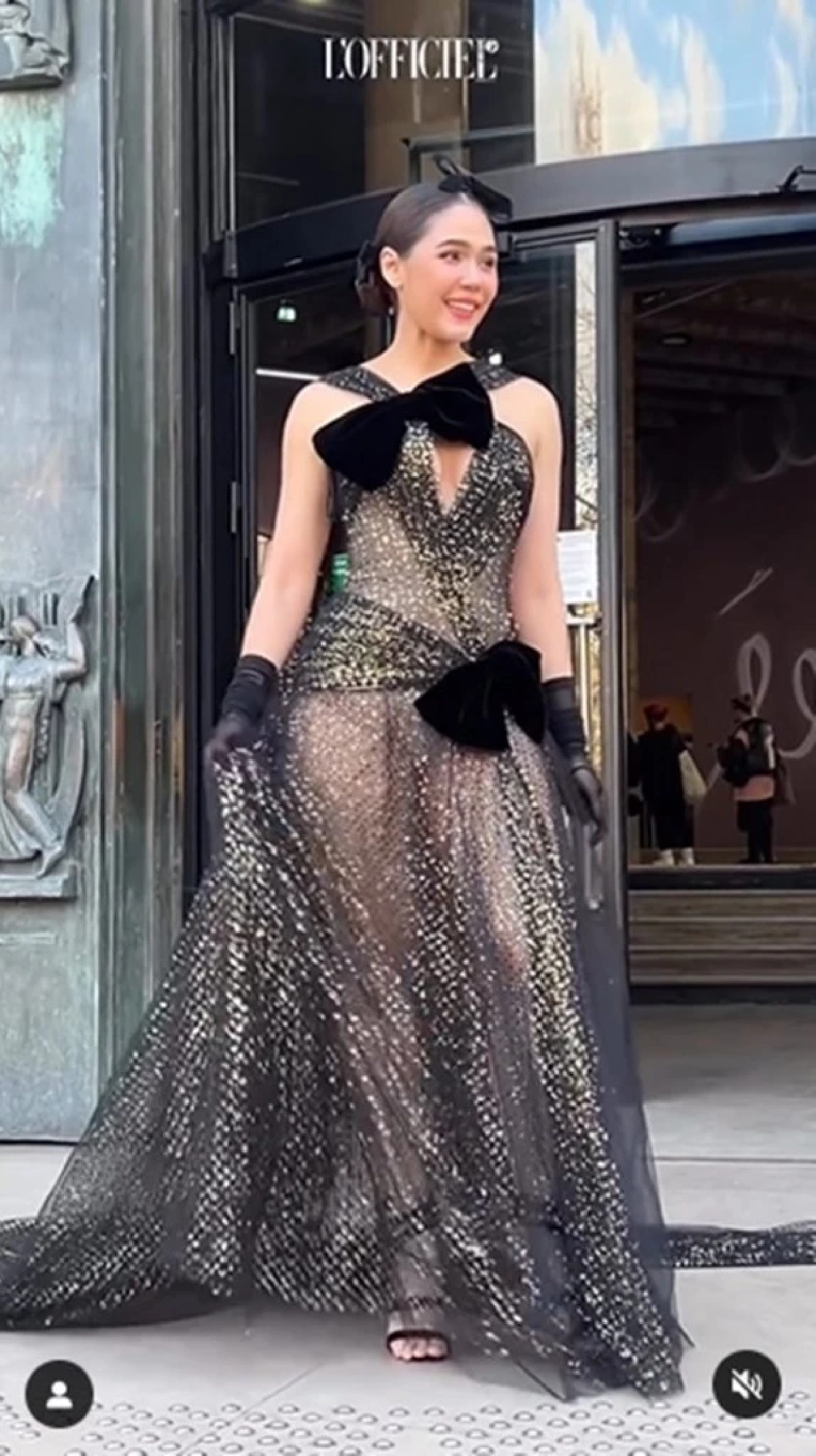 แต่ที่ทำเอาหลายคนฮือฮาก็คือลุคร่วมชมแฟชั่นโชว์ของแบรนด์ Georges Chakra ที่ชุดเดรสผ้าตาข่ายประดับเพชรสีดำพร้อมจับจีบดีเทลโบใหญ่อย่างประณีตงดงาม เผยหุ่นปั๊วะ พร้อมเว้าผ่าอกอวดอึ๋มเซ็กซี่เย้ายวนทุกอณู